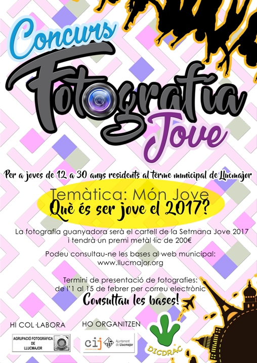 La temàtica d’aquest concurs és EL MÓN JOVE: què és ser jove el 2017, per la qual cosa les fotografies que s’enviïn per participar-hi han d’estar relacionades amb aquesta temàtica. La fotografia guanyadora serà la imatge del cartell de la SETMANA JOVE 2017 de Llucmajor (abril) i de les DIADES JOVES de s’Arenal i Badies (maig).