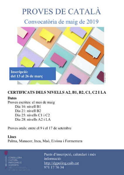 La Direcció General de Política Lingüística convoca proves de català de tots els nivells per al mes de maig de 2019. El període de matrícula és del 13 al 26 de març. En els documents adjunts en trobareu tota la informació.